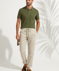 Camisa Masculina de Linho Bege Claro com Mangas Dobradas