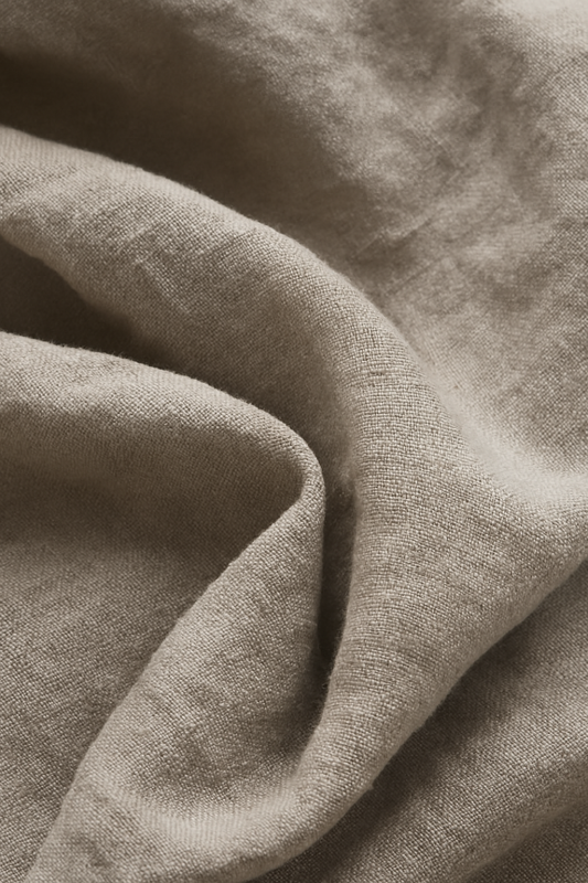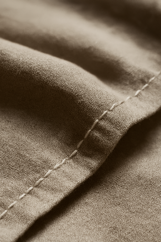 Dobras naturais, toque leve, presença que se molda ao corpo. O linho é matéria viva — ele acompanha o gesto, não o prende.