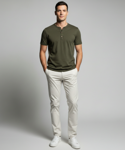 Sua modelagem slim-fit garante um caimento elegante e moderno, enquanto o toque extra-suave do tecido proporciona conforto inigualável, ideal para os dias mais quentes. A cor off-white, atemporal e versátil, reflete a leveza da areia e a tranquilidade da natureza, tornando-a perfeita para combinar com qualquer item do seu guarda-roupa.